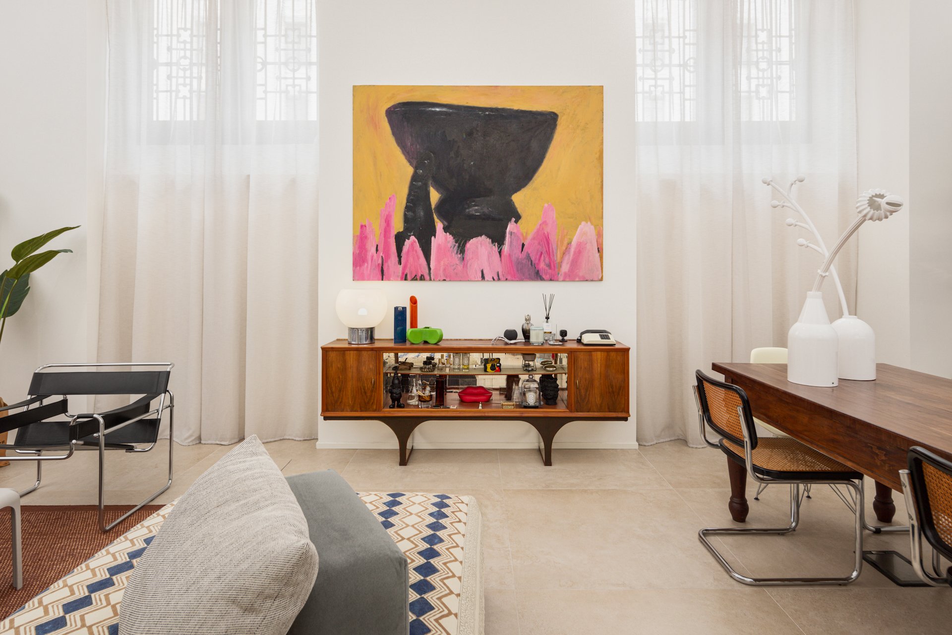 Gli ambienti mescolano con sapienza il fascino del vintage con l’energia del contemporaneo. Mobili d’epoca e pezzi iconici della storia del design convivono con soluzioni disegnate su misura, forme attuali e tecnologie smart, creando un equilibrio tra tradizione e innovazione.