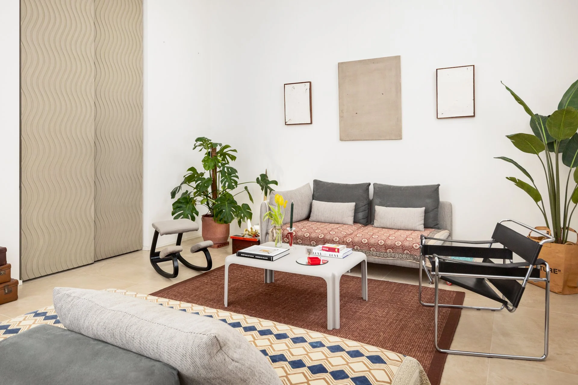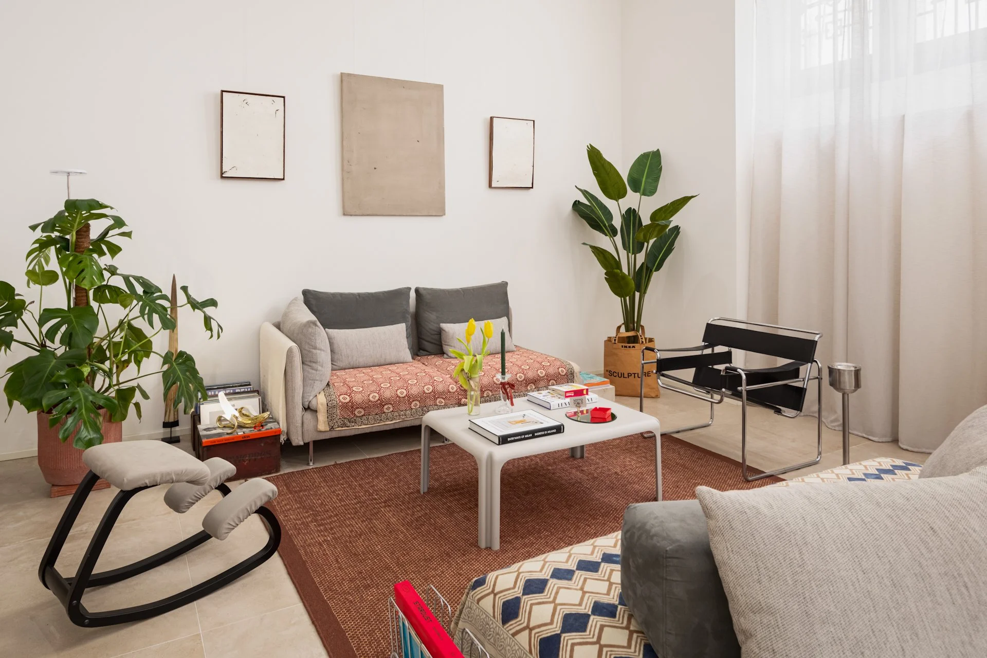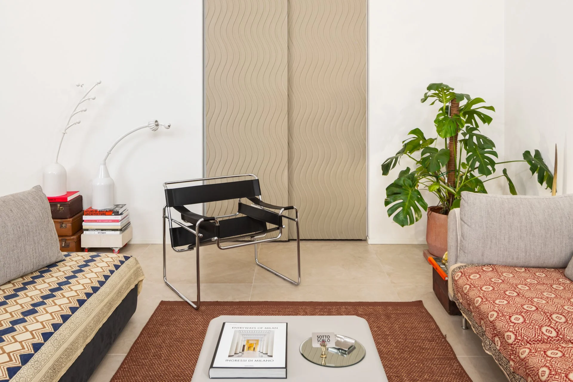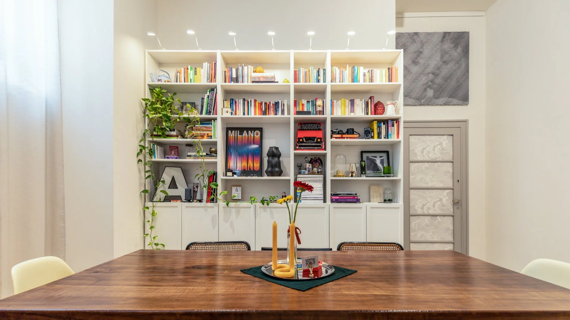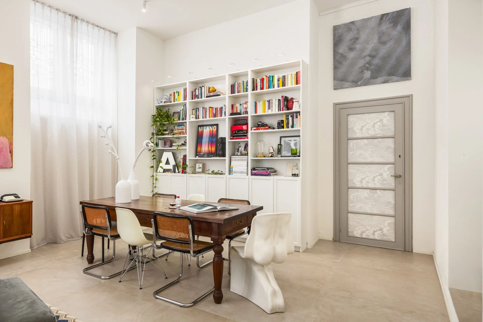 Ampio salotto milanese dalle tonalità chiare e naturali: sono gli arredi, i complementi e gli innumerevoli oggetti a portare colore ed energia.