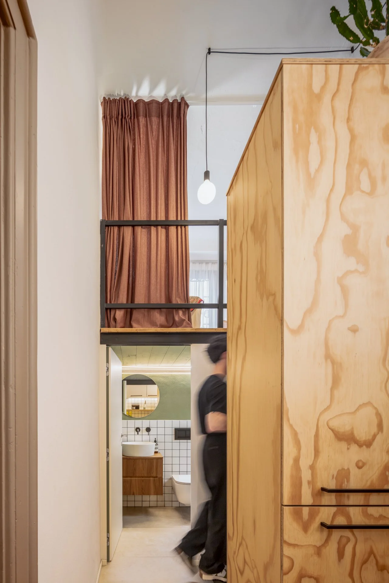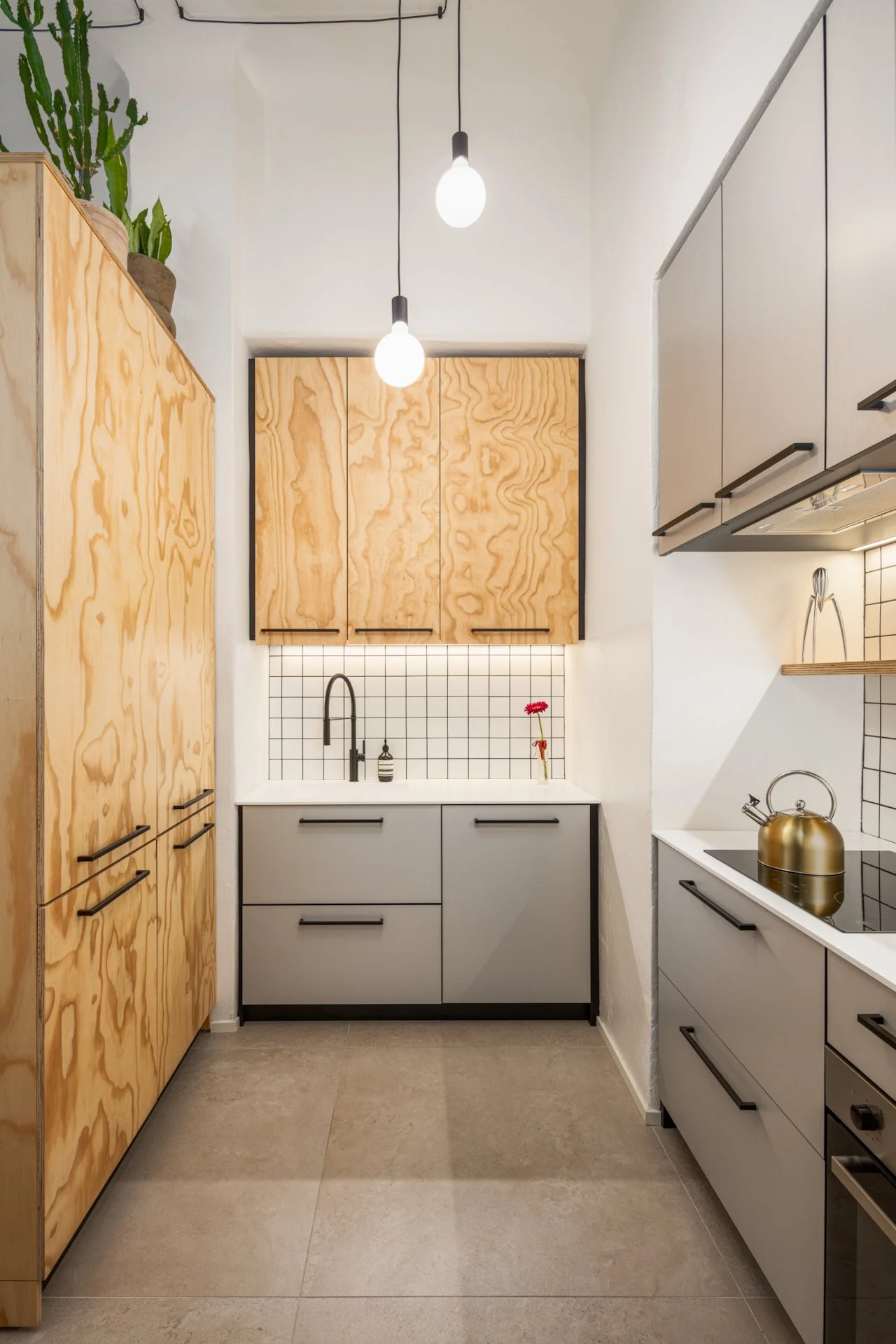 È disegnata su misura con contrasti netti che caratterizzano l’ambiente: le venature calde e sinuose del legno multistrato fenolico di pino si accostano alla razionalità dell’alluminio cannettato. Il tutto stagliato su uno sfondo a quadretti bianchi a fuga nera. Un solo lampadario a sospensione illumina puntualmente due diverse aree.