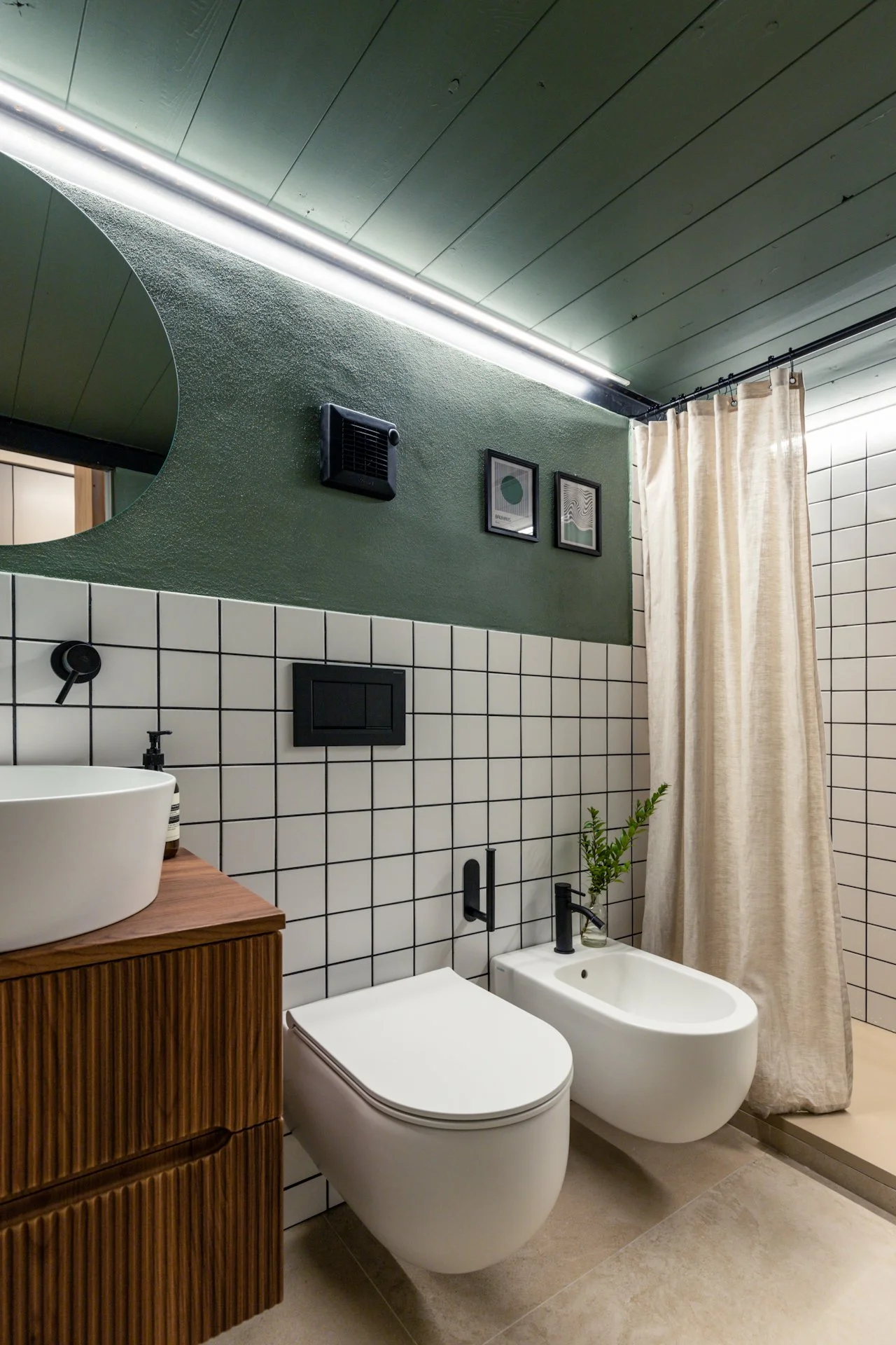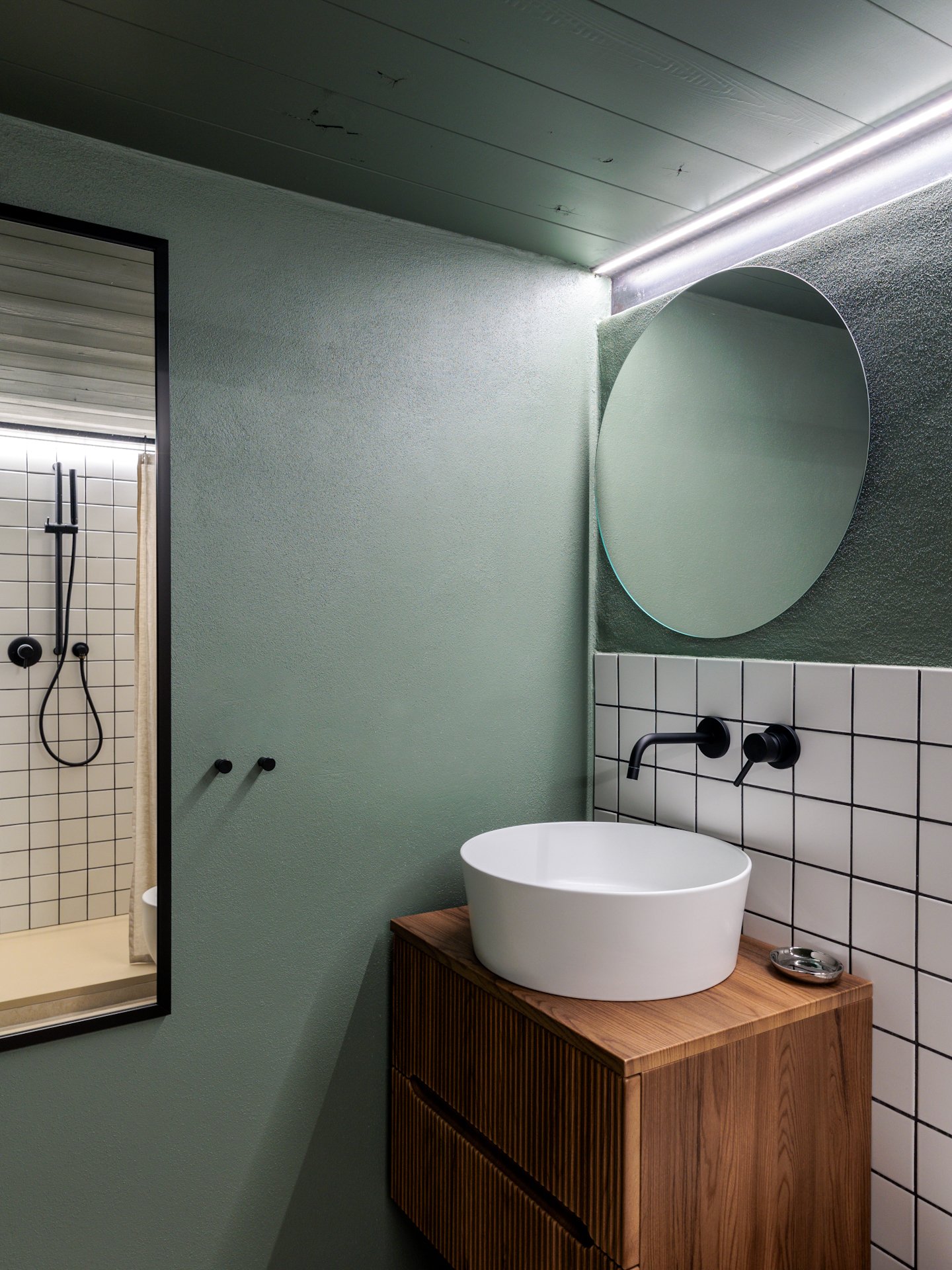 Il verde salvia avvolge l’ambiente, accostato a ceramiche a quadretti e legno di noce canaletto. Il tutto illuminato da luci calde soffuse.